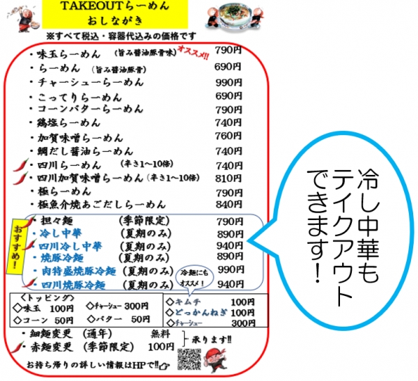 お持ち帰りらーめん、細麺に変更可能になりました!!大人気メニュー「担々麺」もお持ち帰りできます!!